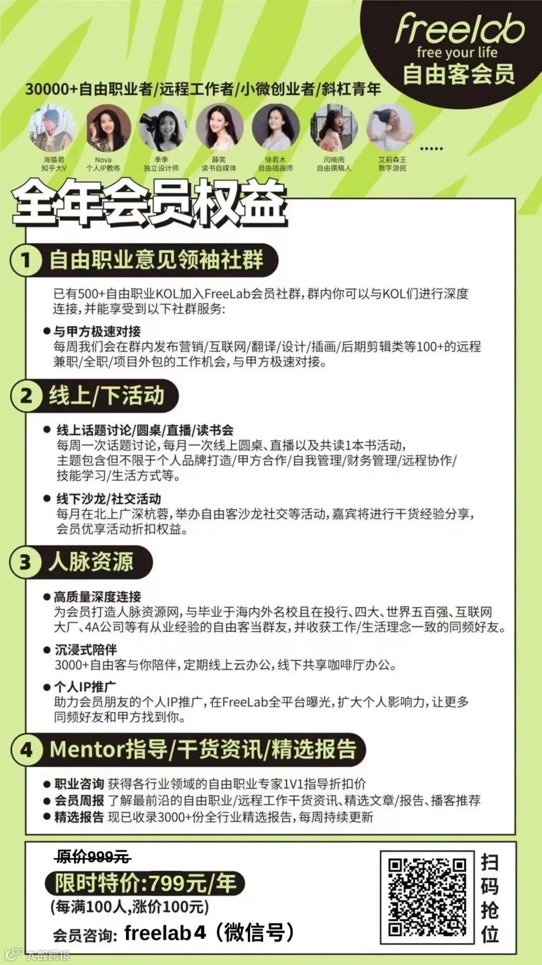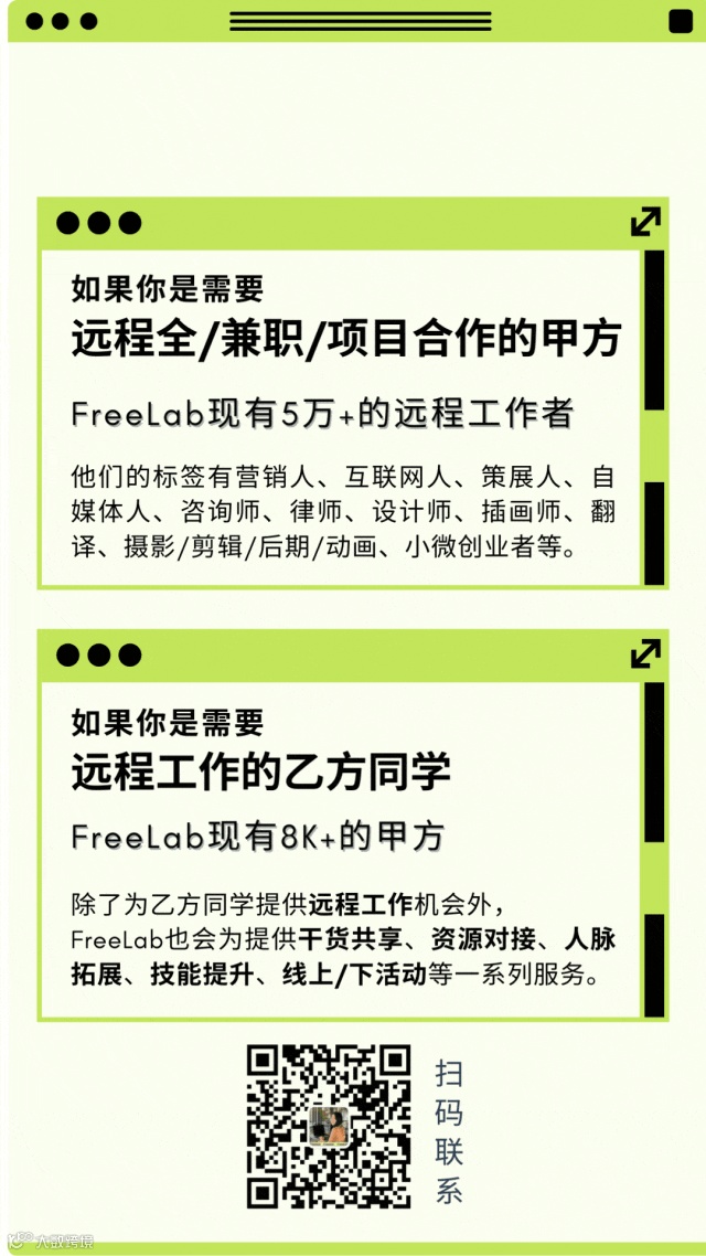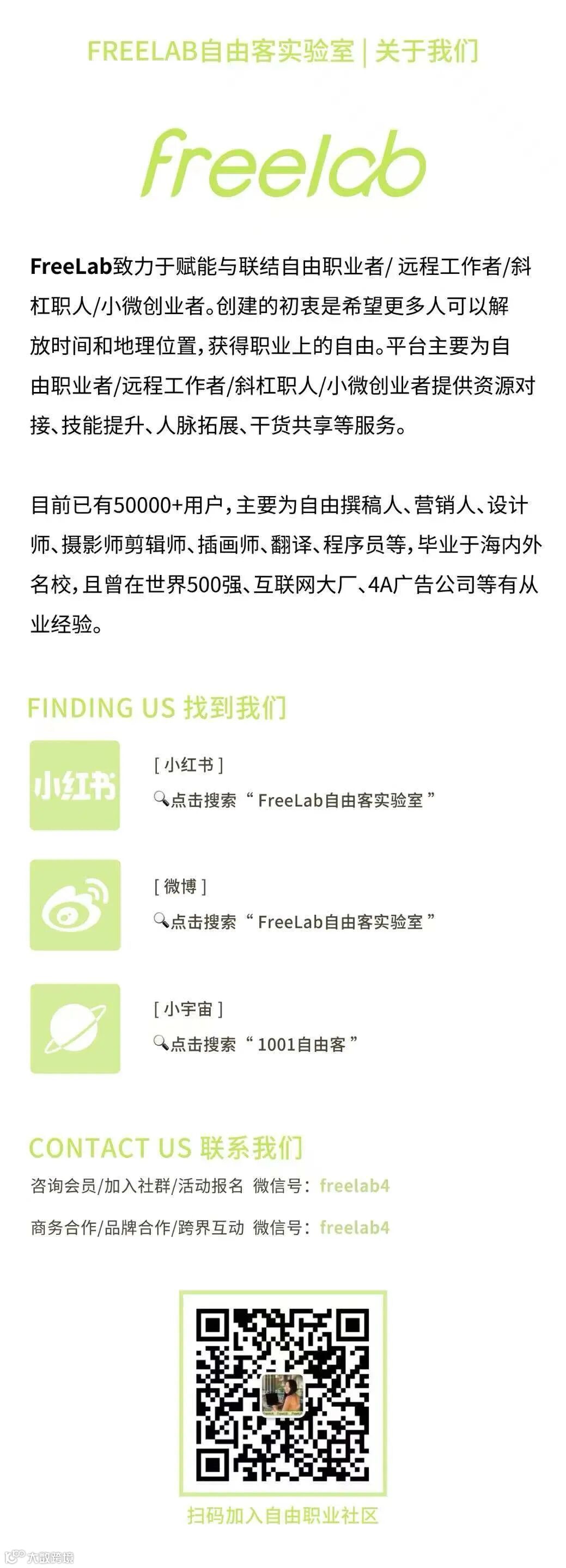 Freelab致力于赋能与联结自由职业者/ 远程工作者/斜杠职人/小微创业者。创建的初衷是希望更多人可以解放时间和地理位置,获得职业上的自由。平台主要为自由职业者/远程工作者/斜杠职人/小微创业者提供资源对接、技能提升、人脉拓展、干货共享等服务。
