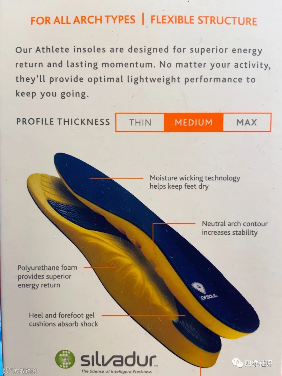 相比之前测评的Sof Sole Airr,Sof Sole Perform的定位更为亲民:对比前者34.99美元的零售价,Sof Sole Perform只需19.99美元,这还是在没有任何折扣的情况下。在零售商网站开折期间,以10美元甚至5美元的价格入手绝非不可能。我在国内淘宝也查了一下,由于新老款式的不同,价格在100~150人民币上下。这款鞋垫分为薄、中、厚三种,四维本期测评的款式厚度为“中”。