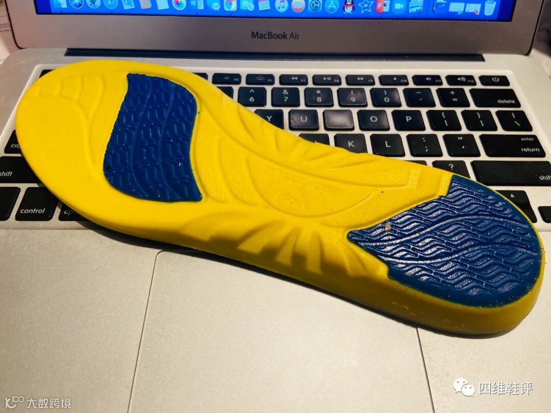 首先说一说它的基本脚感吧,毫无疑问胜过市面上几乎所有原厂鞋垫,当然这其中排除极个别的赞助鞋垫以及可嵌入式中底。鞋垫的黄色部分为聚亚安酯发泡材料,前后掌两块蓝色区域则为额外附加的缓震胶,这与Sof Sole Airr前掌的蓝色缓震胶成分与质感都很像。与Sof Sole Airr不同的是,Sof Sole Perform的中足部分没有支撑片,只有运动鞋垫典型的足弓处上收设计,稍后我会说到在运动强度下的表现。
