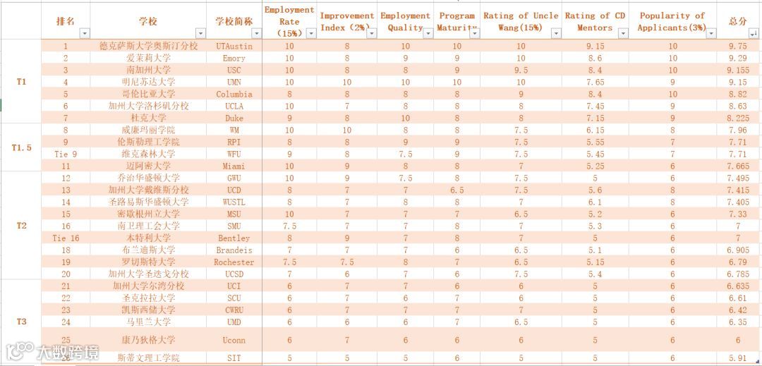 就业率Employment Rate(15%):中国学生在美国就业以及回国big name就业率情况,对没有第一届就业的项目,给予6.5-7.5的预估分数;