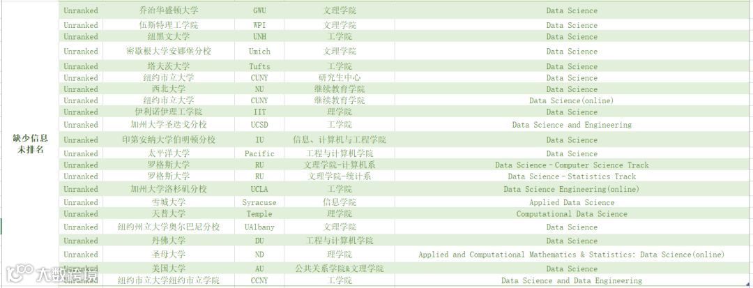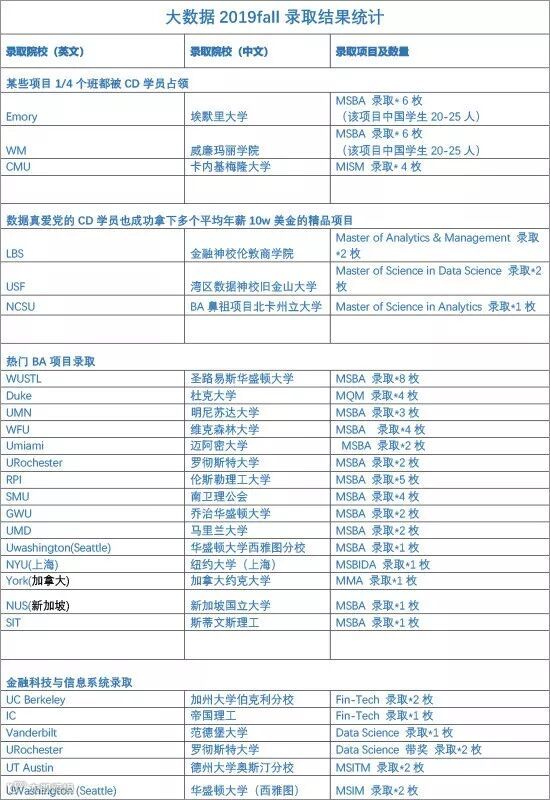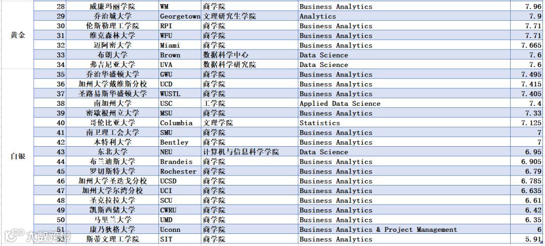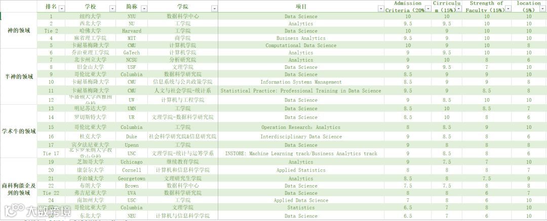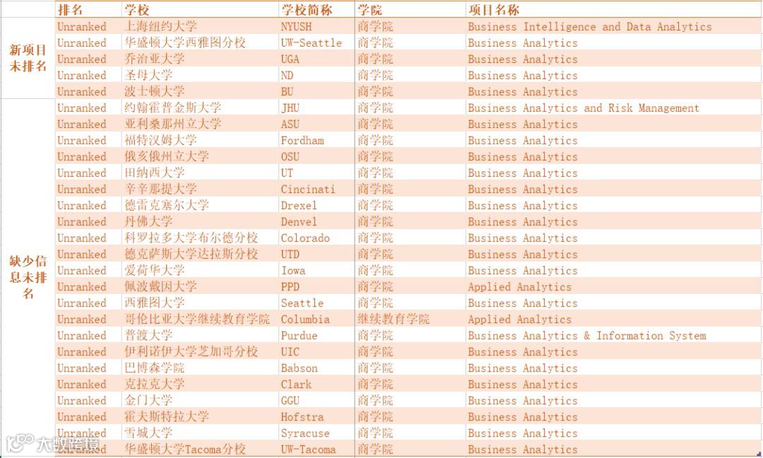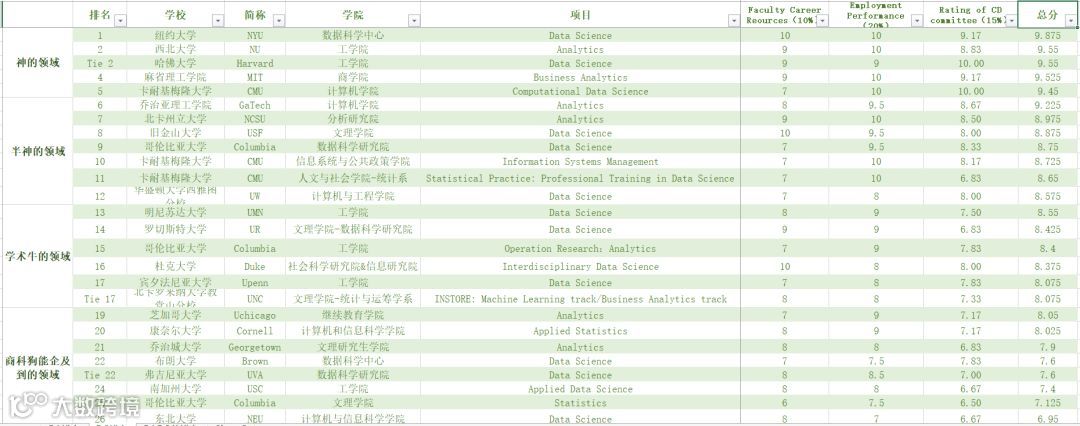参加Data Science/ Analytics项目排名的项目:包含在中国学生中有一定知名度与影响力的DS, Analytics, IS-BIDA track, Stats-DS track等,只要课程深度和中国申请人影响力同时到达,并信息充足,就会出现在技术向的Data Science/ Analytics项目