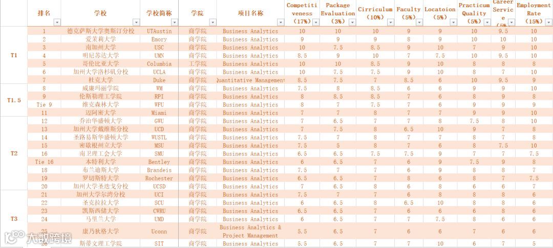 参加Business Analytics项目排名的项目:大致原则是,在商学院下的Business Analytics及其他名称,同样性质的项目,排除工程技术属性强的到达Data Science级别的项目。其中两个意外是MIT与哥大,MIT虽然下属于Sloan商学院,并在BA申请人中有极高人气,但是其录取candidates的stereotype,资源属性及强调的东西,都更偏向于DS的群体,并对BA群体有碾压性优势,所以本次综合考虑,将MIT MBAn放入DS/Analytics群体。相似原因,虽然哥大MSBA属于IEOR工学院,但是其招生的Stereotype以及课程更偏向BA,所以哥大MSBA被放在了BA排名中。这样很好的保证了所有商学院BA项目的平衡性。同时,今年刚开始招生的项目,如圣母 波士顿大学 华盛顿大学西雅图分校不加入排名,未获取到重组信息的项目,如亚利桑那州立 Fordham,也不加入排名。