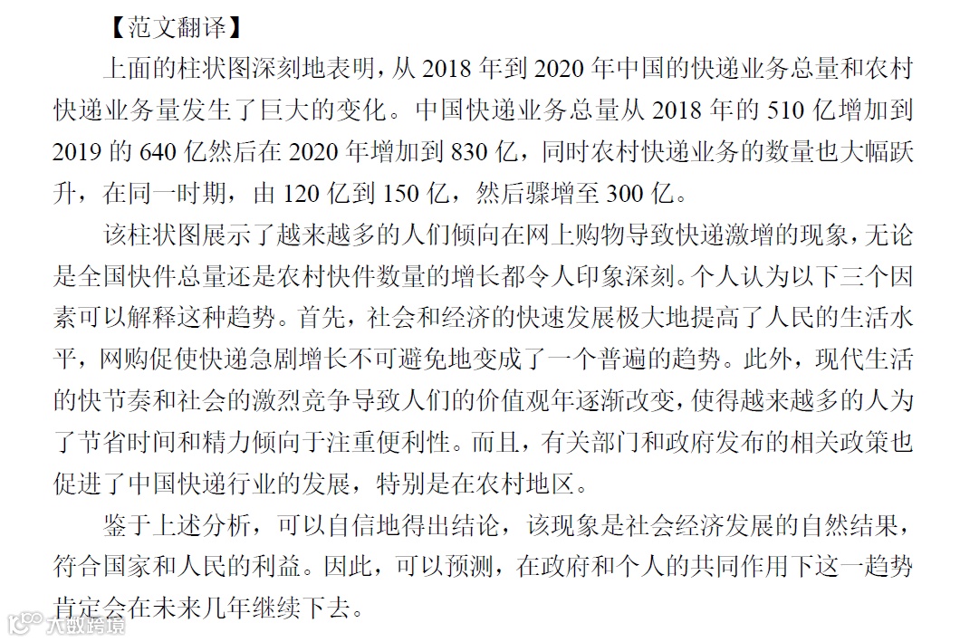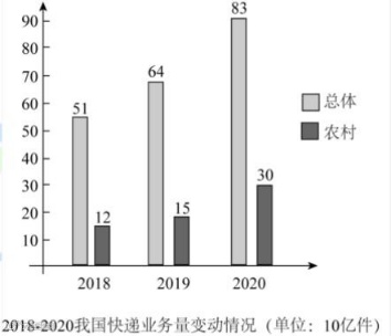 What is profoundly demonstrated in the above column chart is that dramatic changes have taken place in the total and rural amount of China's expressage from 2018 to 2020.The total number of China's expressage increased from 51 billion in 2018 to 64 billion in 2019 and then to about 83 billion in 2020,and meanwhile the number of the rural expressage also significantly jumped from about 12 billion to 15 billion and then to 30 billion in the same period.The column chart illustrates the phenomenon that people in mounting numbers prefer to purchase goods online delivered by the expressage which ascends impressively both in total and the rural.Three reasons,in my belief,can account for this trend.First and foremost,with the acceleration of the society and economy enormously boosting people's livelihood, the dramatic increase of expressage has inevitably turned out to be a prevailing trend.Moreover , the fast pace of modern life and the fierce competition of society result in people's gradually changed values,leading more and more people tend to put much emphasis on their convenience in order to save time and energy.Furthermore, relevant policies issued by the authorities and government advance the development of the China's expressage,especially in the rural areas