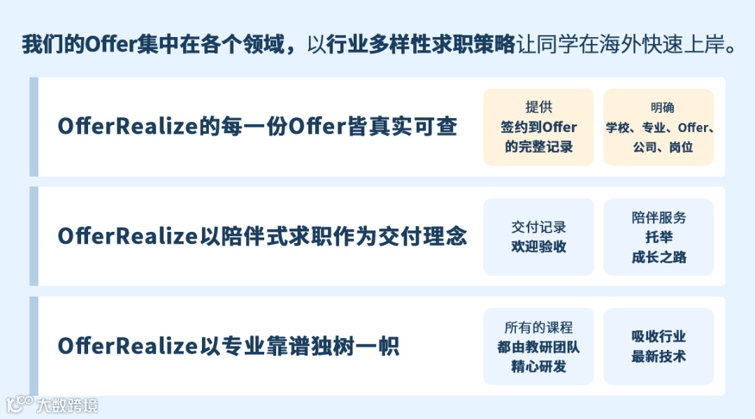 Offer护航: 从行业分析、岗位匹配到最终Offer选择,导师全程跟进,以深厚的实战经验和行业洞察力,为你的求职之路保驾护航,直至Offer Realize(梦想实现)。