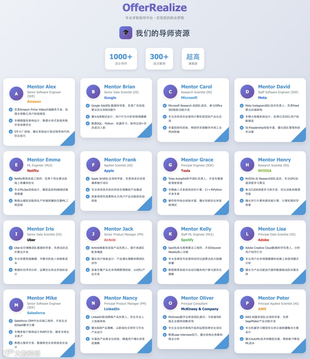 OfferRealize已经具备了非常完备的服务体系和行业top的求职结果,也招募到了更多包括Meta、Microsoft、Apple、Amazon、Uber等数据大厂;麦肯锡、Bain、BCG等知名咨询公司;高盛、JPMorgan Chase等著名金融机构以及Point72、CPPIB等金融顶级大买方的内推导师。