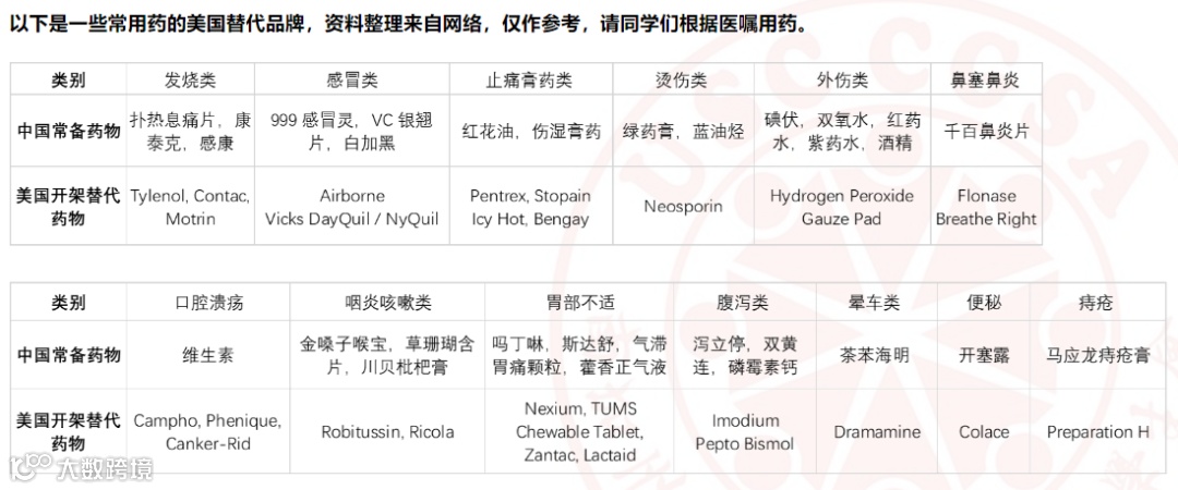 美海关建议入境者仅携带旅途适量必需的药物。如需携带的药物中含有潜在的成瘾性或麻醉剂成分,请务必向海关官员申报携带的所有药物。禁止携带含有以下违禁成分的中药和中成药:麻黄碱类药物、士的宁类、吗啡类、含有动物或动物器官类等。具体关于个人入境携带和进口药物的有关信息请参见食品和药品管理局网站(FDA官网网址:www.fda.gov/industry/import-basics/personal-importation)的药品网页。以下是我们整理的一些常用药的美国替代品牌,资料整理来自网络,仅作参考,请根据医嘱用药。