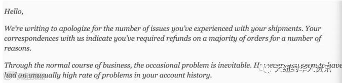 如果你网购时大量退货,可能会受到这样的警告邮件。大意是:我们已经收到了你退款的要求,偶尔出现退货问题是不可避免的,但是您的账户记录中退货比例高的有些异常!