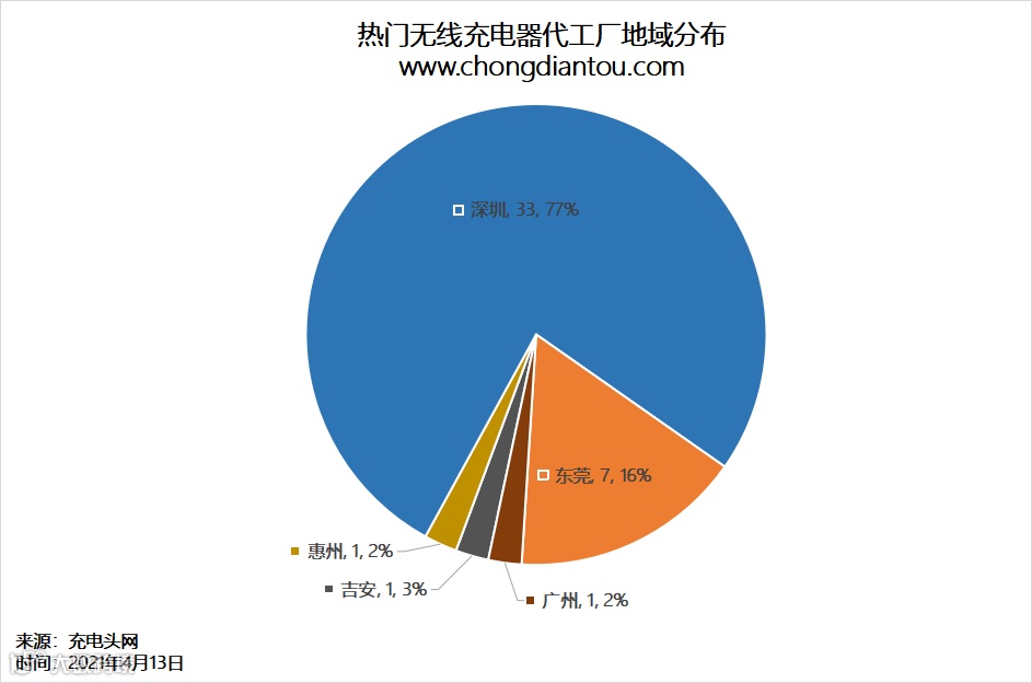 从无线充电器代工厂的地域分布图来看,其中77%的厂家来自深圳、16%厂商位于东莞,粤港澳大湾区成为了最大的无线充电器代工基地。