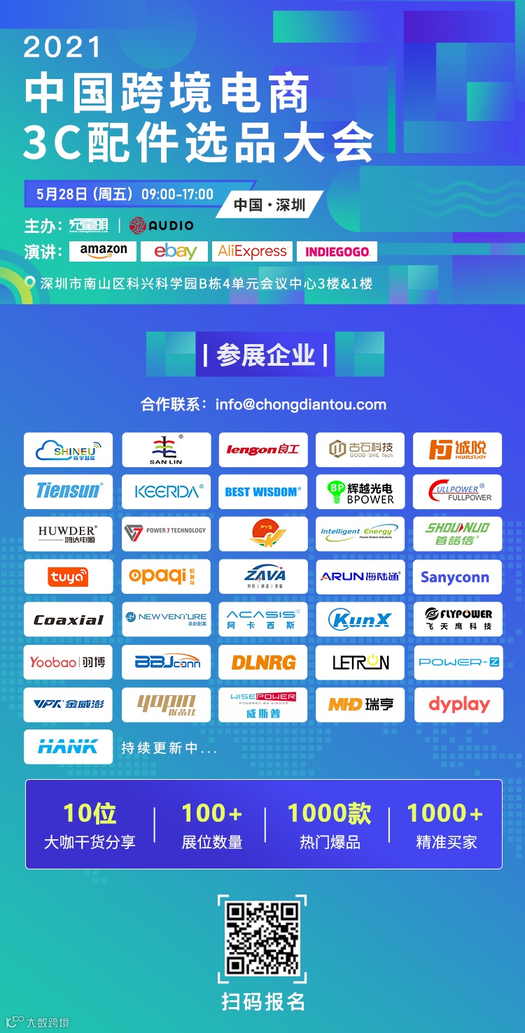 同时也欢迎大家报名参加充电头网在5月28日举办的2021中国跨境电商3C配件选品大会,这是一场专门为众多代工厂与跨境电商采购打造的面对面交流平台。如有参展需求,请联系邮箱:info@chongdiantou.com
