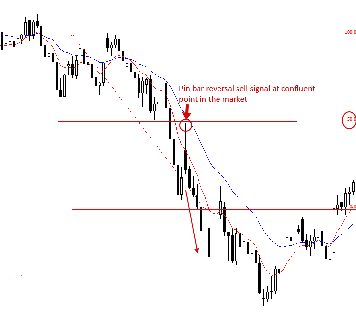 In the image example below, we can see a pin bar setup that formed at a confluent point in the market: