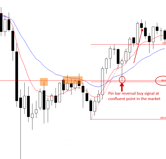 Note that the pin bar trade setup showed rejection of a key horizontal support level as well as the 50% retrace of the last major move, thus the pin bar had “confluence” with the surrounding market structure…