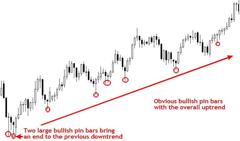 In the following chart example we will take a look at pin bars occurring within the context of a trending market; my favorite way to trade them.
