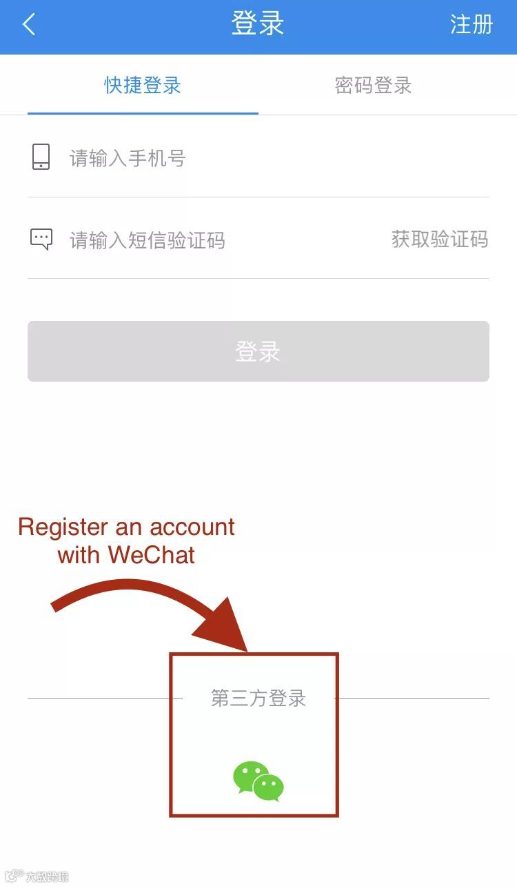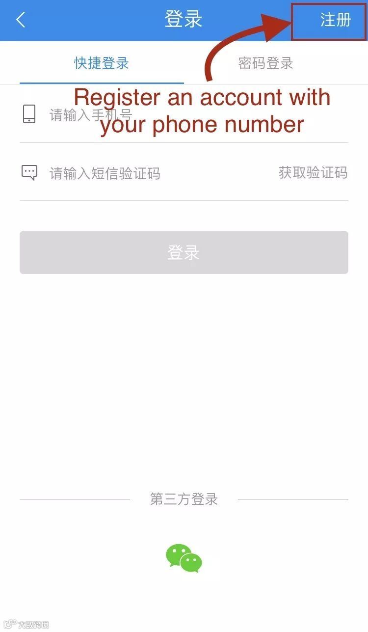 2. Open app, tap on ‘添加’, and you will be asked to register an account with your phone number or WeChat account: