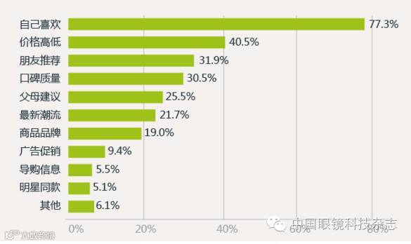 对于90后、95后群体的标签有很多,二次元、三次元均表现了这一特殊群体的生活习惯,自我世界的主观思想主导更为重要。据数据统计,在日常购物时,有77.3%的90后倾向于自己喜欢,40.5%的会关注价格高低,31.9%会受到朋友推荐的影响,而广告促销和导购信息的关注度分别为9.4%和5.5%,对90后群体消费影响相对较小。因此对于眼镜行业来说,如果主要的消费群体是年轻一代,那么在设计方面来说就要更多考虑这代人的需求。