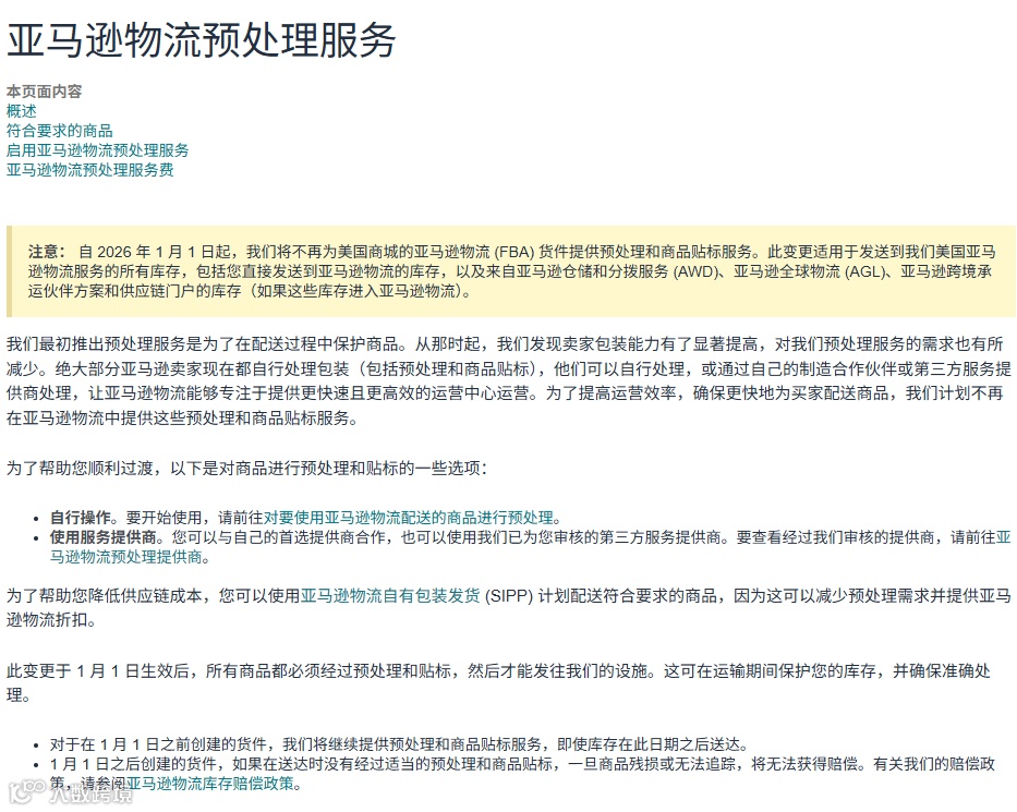 2025 年 7 月 29 日,亚马逊美国站发布了一则重磅通知,宣告从 2026 年 1 月 1 日起,将全面停止 FBA 提供的备货准备和商品标签服务!