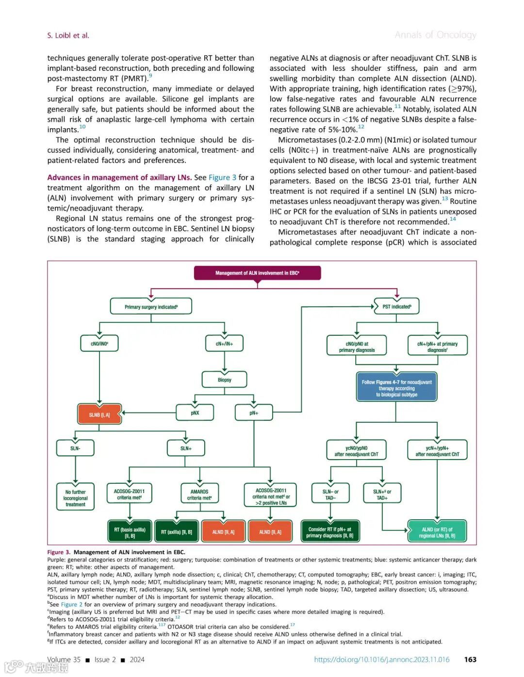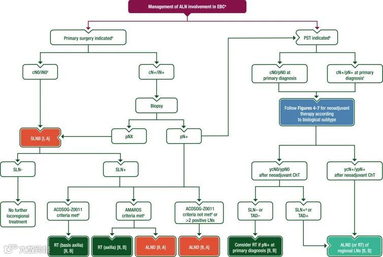 Advances in management of axillary LNs See Figure 3 for a treatment algorithm on the management of axillary LN (ALN) involvement with primary surgery or primary systemic/neoadjuvant therapy.