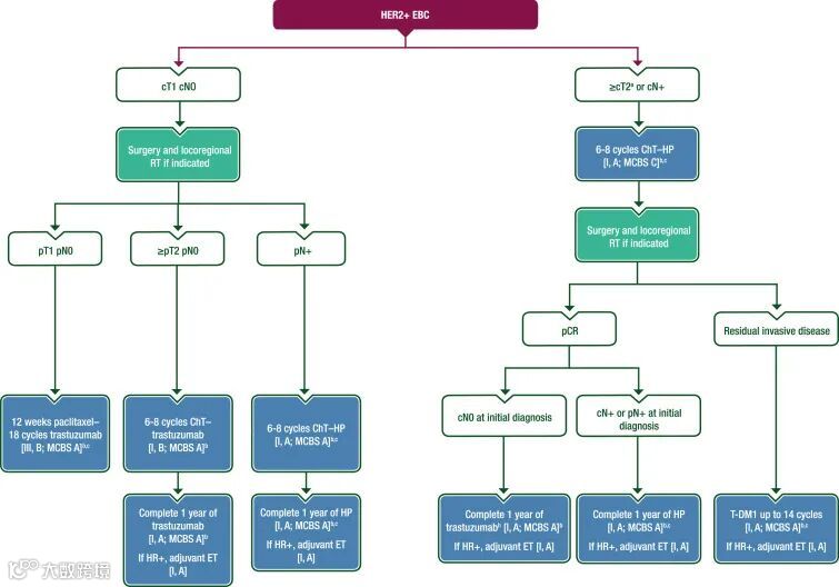 Adjuvant therapy for HER2-positive breast cancer Patients with HER2-positive breast cancer treated with initial surgery should receive adjuvant treatment with HER2-directed therapy plus ChT and ET if HR positive. ESCAT scores apply only in the case of HER2 gene amplification by FISH/chromogenic in situ hybridisation.