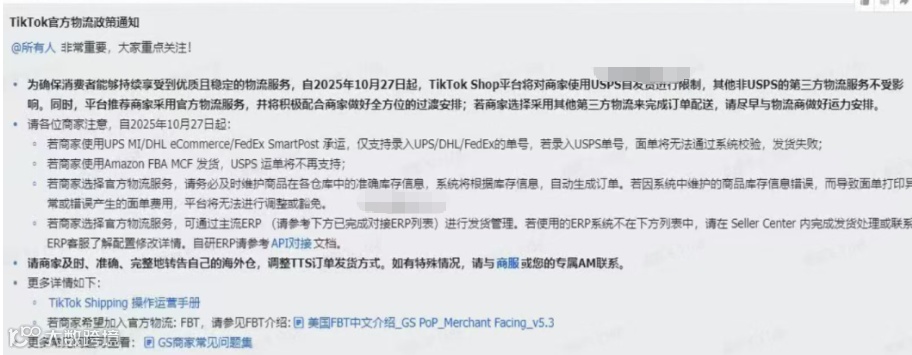 TikTok Shop宣布,从10月27日起,禁用USPS自发货;需要还要用USPS发货,必须采用平台官方提供的面单系统!
