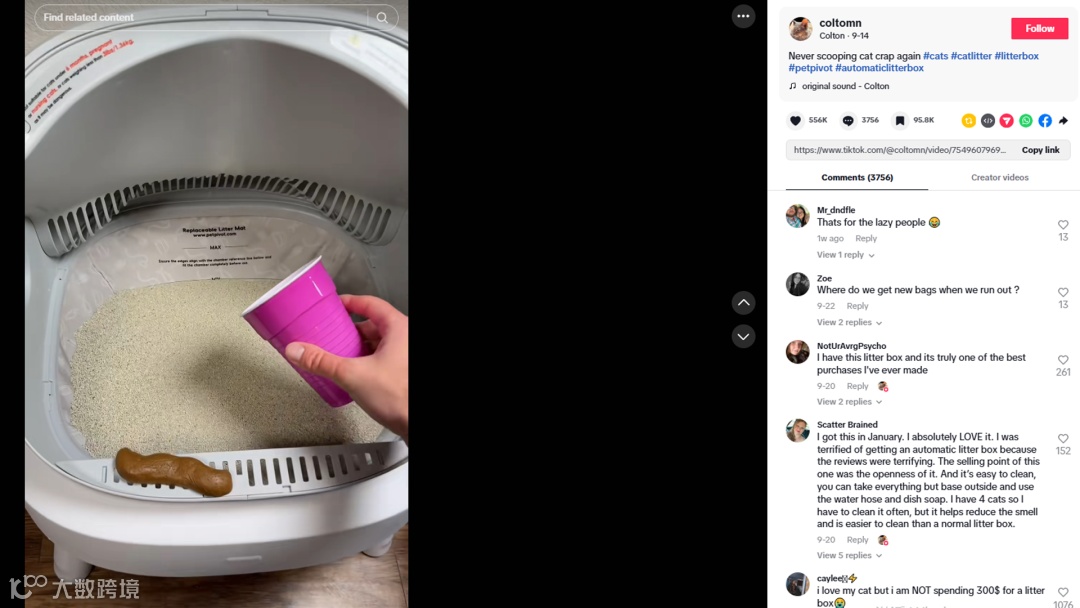 Coltomn还在视频中对比了自己以前使用的旧款猫砂盆容易弄脏机器的缺点,强调PetPivot 便宜、安全、易用,还附带长时间垃圾袋供应,展示了猫砂平整、干净且不留异味的效果,并在最后自然植入购买链接,整个视频兼具趣味性和实用性,直击养猫家庭的痛点。