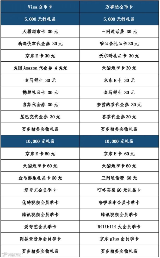 活动期间,申办Visa、万事达全币信用卡,报名并单月内消费折人民币5,000元/10,000元,即可领取对应档次的礼品,包含30元/60元人民币面值的各类电子会员券、热门季卡会员及精选实物礼品。活动期间每名客户可分别在5,000元/10,000元档次各领取一次礼品。 |