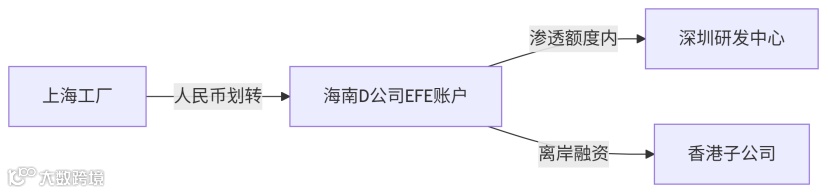 [k]长三角C集团通过海南D公司(EFE账户)归集境内工厂资金,并向境内研发中心拨款。[k]