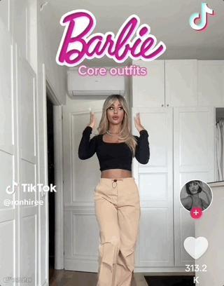 最有趣、最成功的芭比社交媒体趋势之一是复刻芭比娃娃的标志性造型。许多服装配饰品牌都在利用这部电影来销售粉红色的商品并吸引新顾客。如果你的商品中没有粉色单品,不要紧,看下图中的博主变身芭比造型前穿的是日常服饰,可见常规款式的非粉色服饰的植入空间也是很大的。