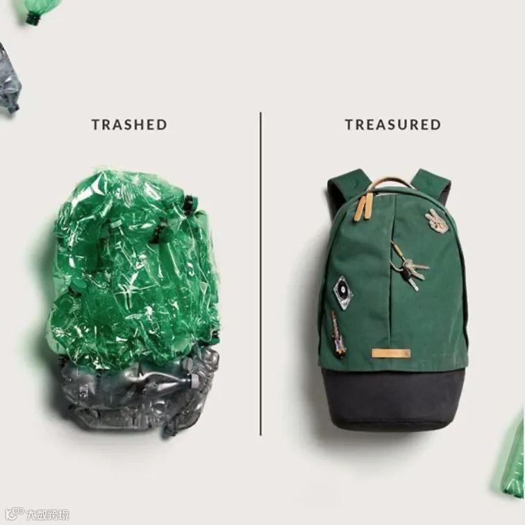比起前后对比,两种反差感极强的事物对比也能够吸引观众。Bellroy的这则图片广告就是应用了垃圾和宝藏的反差感,让人很快就get到该品牌将回收的塑料瓶制成书包,变废为宝的特质。