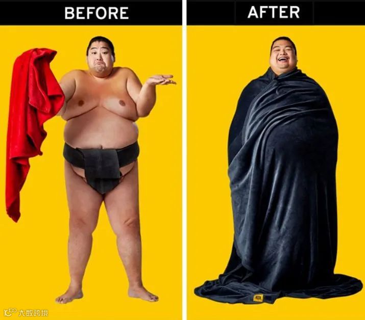 Before&After 前后对比一直是有效的广告策略。Big Blanket Co.的广告就是利用这样的前后对比效果,结合幽默感逗乐观众的同时展现产品特征:BIG