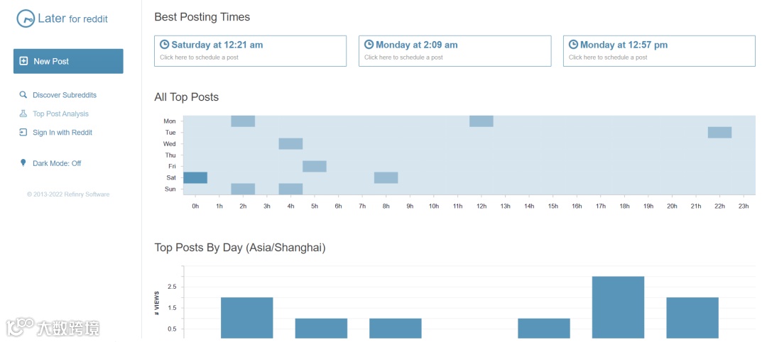 Reddit Later可以设置最佳的发布时间,点击左侧菜单栏的Top post analysis,搜索栏搜索要发帖社区,设置好时间段后点击Analyse Subreddit Traffic,系统会自动分析并出现Best Posting Times,还能够定时发帖。