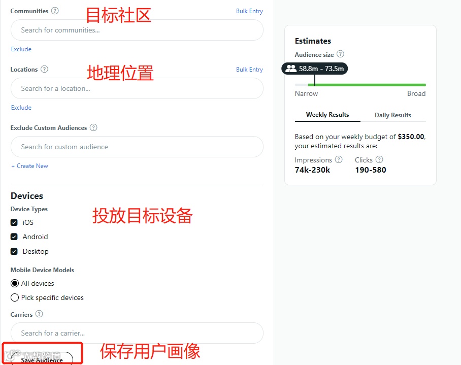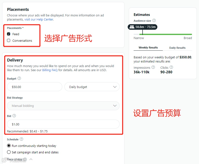 Budget:设置广告费用,可以设置总的广告费用,有Daily budget和lifetime budget两种,按天或者按最高额度设置广告投放金额。