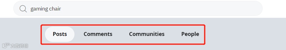 进入主页后可搜索你感兴趣的产品关键词,如下图我搜索了gaming chair后,系统推荐了四种类别,分别是Posts/Comments/Communities/People,可以查看帖子、评论、社区、或寻找好友。