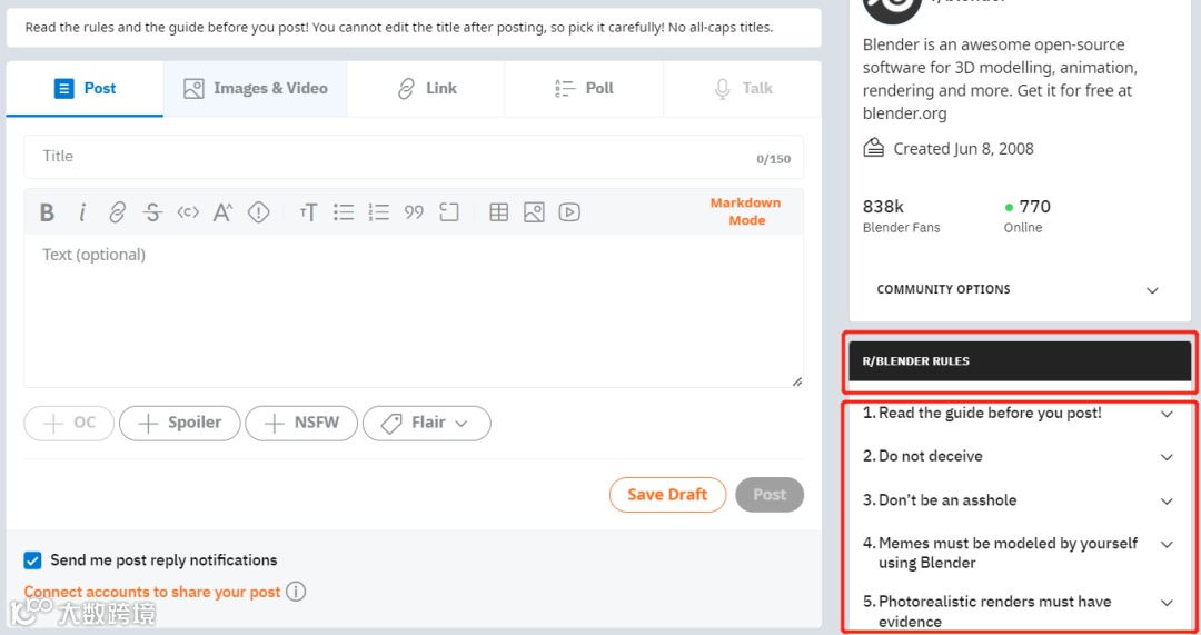 在发帖之前,需要留意每个社区的规则,可以在社区界面的右侧查看,你在该社区的发帖、评论等行为都要遵守这个规则。规则设置可以使用人工审核、机器审核自动化、或用户举报或者对该帖子进行“downvote”的方式处理。违反规则的帖子很容易被删,严重的话有可能导致账号被封。