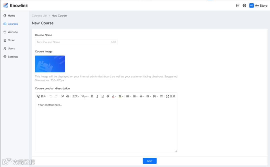 商家在管理台【课程】创建课程,选择图文、音频、视频作为课程小节内容,示例图如下: