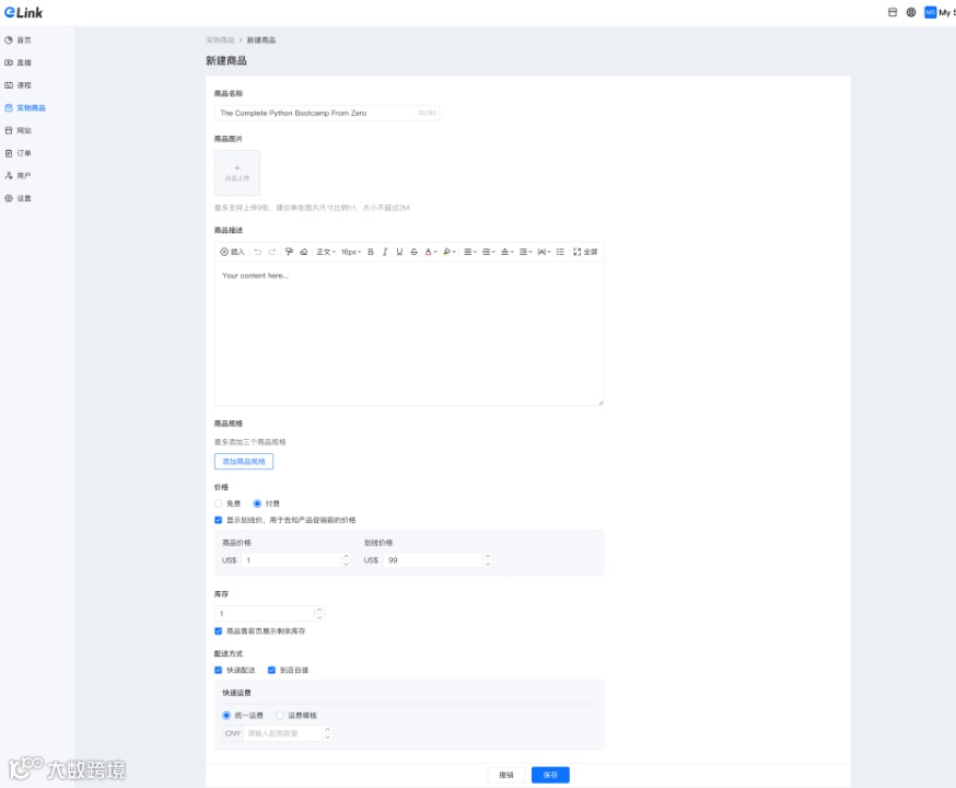 支持创建和售卖实物商品,支持商品多规格多库存设置;支持到店自提和国际物流2种配送方式;支持查看订单状态和物流轨迹;支持直播带货。