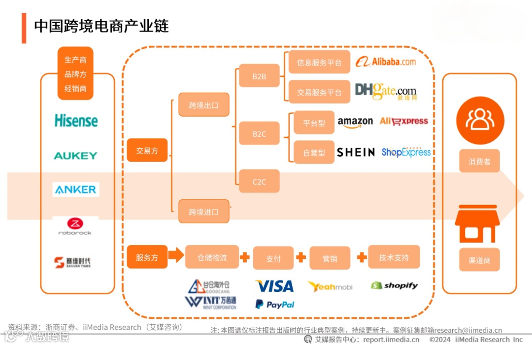 聚焦到产业层面,跨境电商产业是由一系列相关企业构成的生态系统,主要包括产品供应商、电商平台运营商、跨境支付机构、国际物流企业以及配套的报关、售后与咨询服务商等。