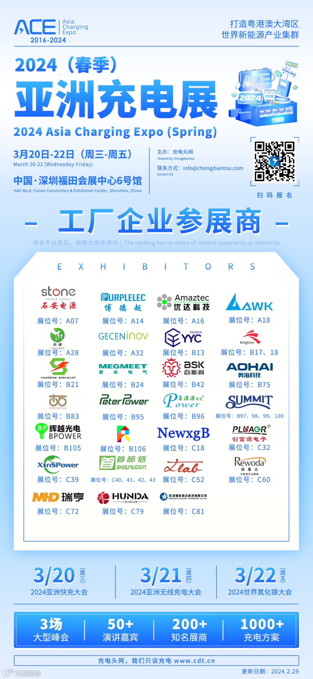 2024(春季)亚洲充电展将于3月20日-22日在深圳福田会展中心6号馆举办,目前已有27家知名工厂企业报名参展。