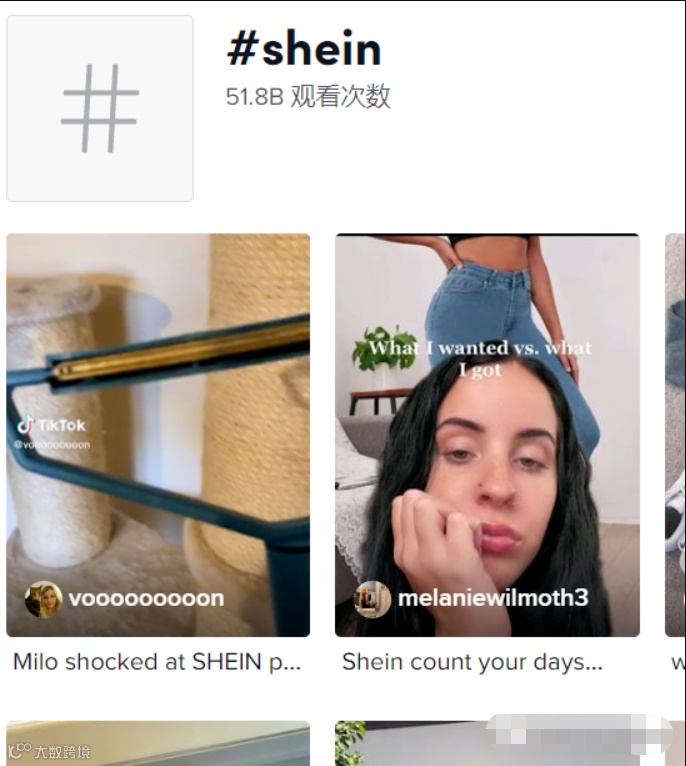除了在一些老牌的图文社交媒体平台注册自己品牌的官方账号进行推广和优惠活动和促销的信息发布,以此收获了一批本就有需求的粉丝之外。还利用达人营销在流行的社交媒体平台上为自己的品牌带热度,进行曝光推广。比如说视频大头TikTok,在其上面Shein拥有自己的热门话题和标签,有许多活跃的创作者积极为它进行着热度曝光和个人推广。