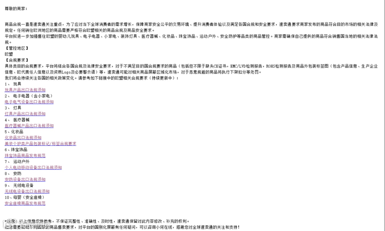平台拟进一步加强售往欧盟的婴幼儿玩具、电子电器、小家电、装饰灯具、医疗器械、化妆品、珠宝饰品、运动户外、安全防护等品类的商品管控。商家需确保自己提供的商品符合销售国当地的相关法律法规。