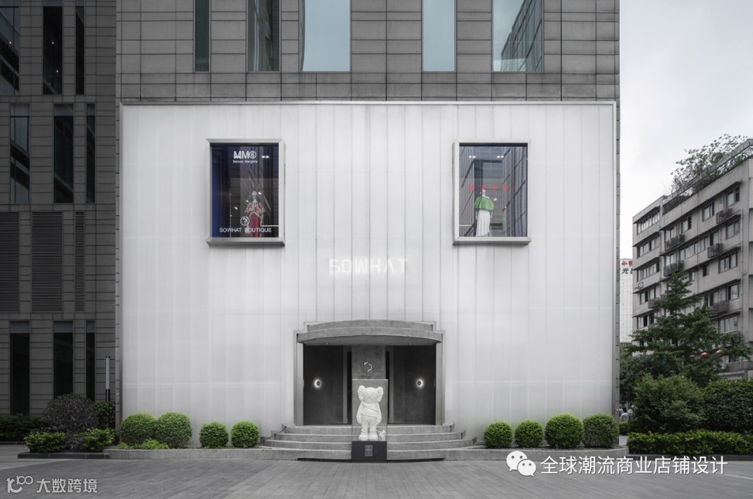 If a city’s retail reflects its level of sophistication, Chengdu‘s development chart would require several pages just to cover one year. Situated in Southwest China, the economic growth of this city has been staggering in the past few decades. It has spawning a retail infrastructure that’s now seeing an accelerated diversification on different levels, and the recent opening of multi-brand boutique SOWHAT can be seen in this light. The store is situated at Jingronghui, a large complex of soaring towers with offices, serviced apartments and residences in the downtown district of Jinjiang, and occupies a 255 sqm. (2,745 sq.ft.) two-storey unit with an entrance of its own on the ground floor. Designed by local architecture practice iZ Design, the store has been given an opaque glass façade which is in stark contrast with the slabs of grey stone of the mixed-use complex. It’s paired with a striking KAWS statue in matching white, signalling SOWHAT‘s discerning fashion focus to any shopper that passes though the door. The half-round steps leading to the entrance form part of a circular shape which extends indoors.