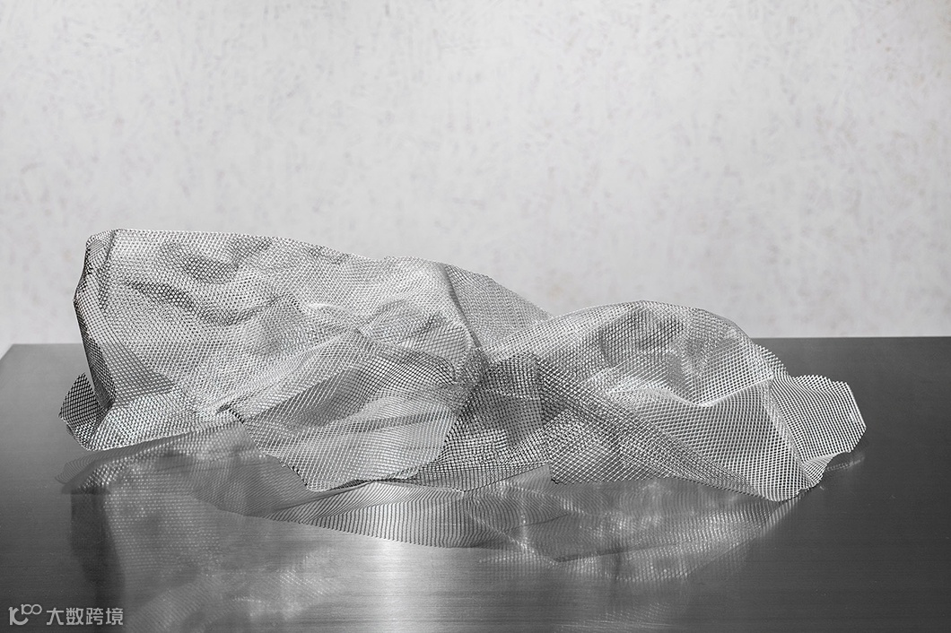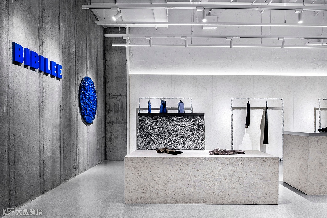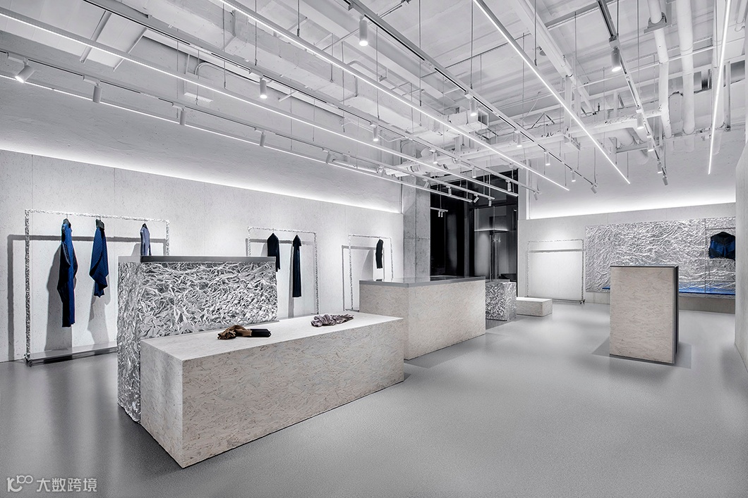 锡纸被揉皱后又铺展开,人为制造出随机的肌理和材质本身的金属质感回应了服装面料的工艺和光泽感,又与哑光的乳白色刨花板产生对比。这些材料加强了人们对于品牌核心面料的感受,成为品牌印象的一部分。