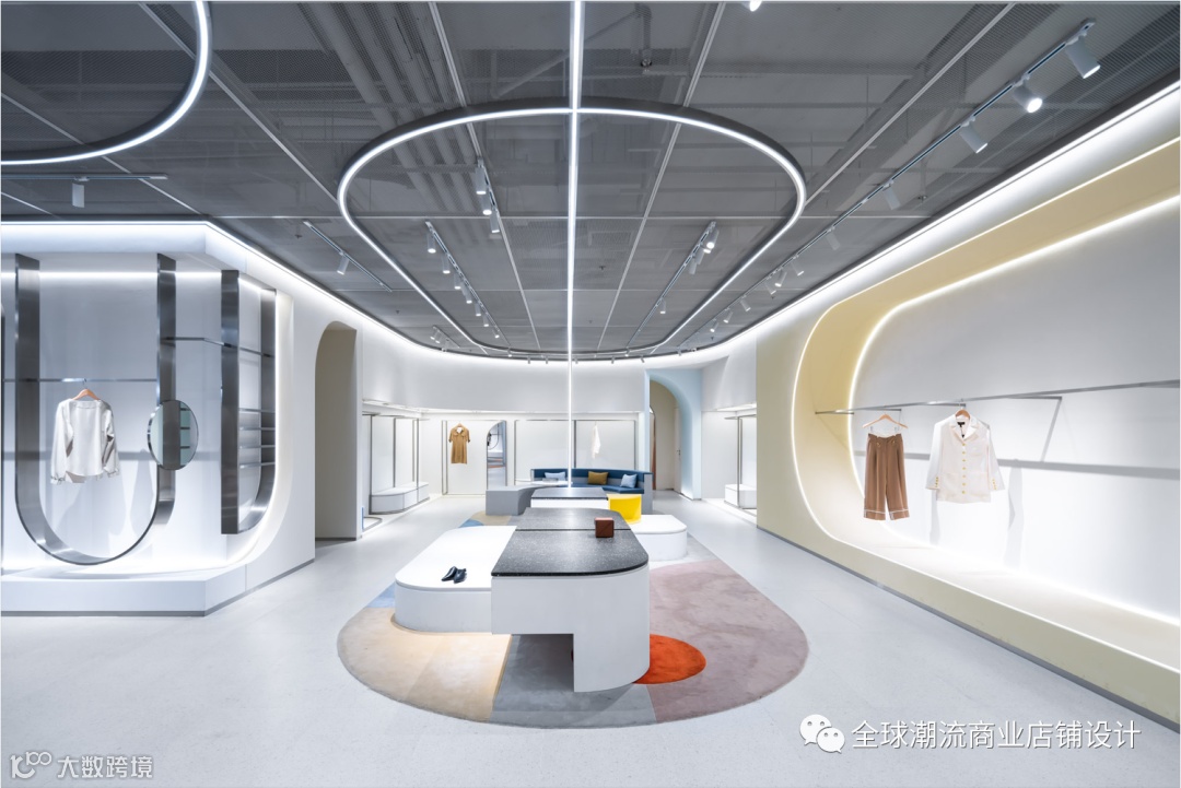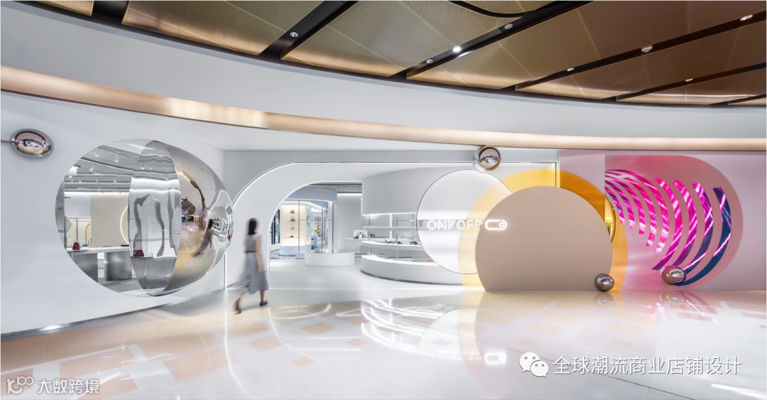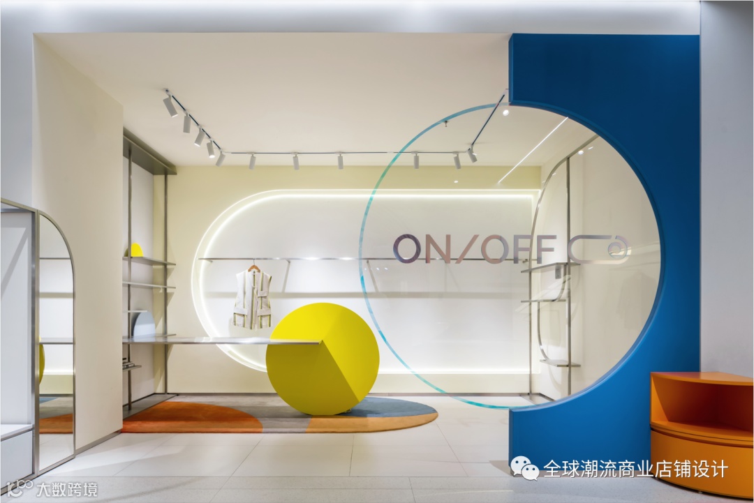 mighty Huangpu river, is exemplary of this new category of upscale independent boutiques catering to a savvy young clientele. The store occupies a 445 sqm. (4,790 sq.ft.) unit on the second floor and features a sleek interior design by Shanghai-based practice Studiolite. Inspired by ON/OFF‘s multi-brand concept which exclusively focuses on emerging fashion designers, the premises see six distinctive sections, each with captured by different settings. The store façade is a sight to behold, embedding visually arresting three-dimensional elements and offering unobstructed peeks of the store interior at the same. The semi-arched entrance is flanked by a halved sphere on which mirrors its surrounds on one side, and an equally optically challenging peekaboo construction with LED screens on the other. serving as a pop-up zone featuring a rotation of fashion showcases. A number of smaller silver spheres adorn the façade, and signal not only a recurring shape in the interior design, but also its fluidity and futuristic edge. As said, ON/OFF features different sections, but the design is as such that all are seamlessly connected by way of curved and arched panelling and cut-out fixtures, similar flooring of course, and last but not least, a mesh ceiling adorned with linear LED light fixtures whose geometric layout adds another visual layering to the store settings, as do the various materials, such as terrazzo, marble, metal and carpeting, and bright colour palette. As for the presentation of its coveted merchandise, the store has a clever modular frame and display system which allows endless configurations. ON/OFF stocks more than 60 up-and-coming Chinese brands and designers, including Wan Yi Fang, Ontime_Lab, Vmajor, KKtP, deepmoss and Sans Titre.