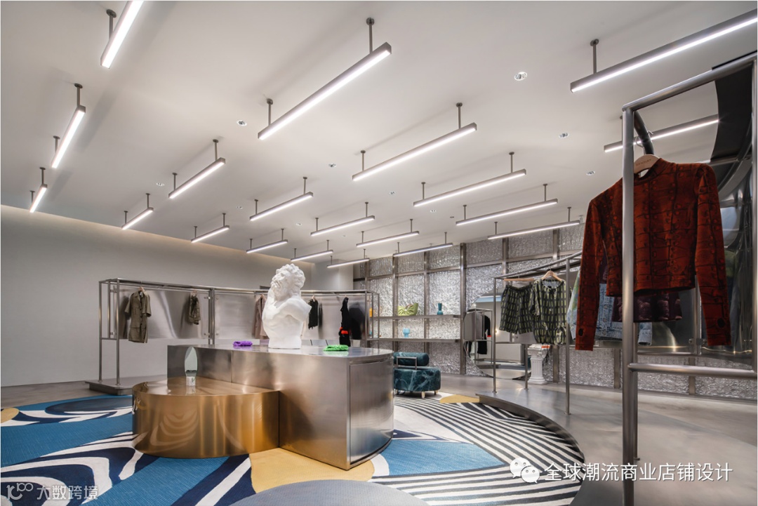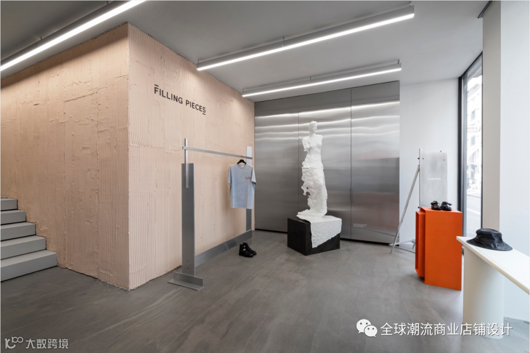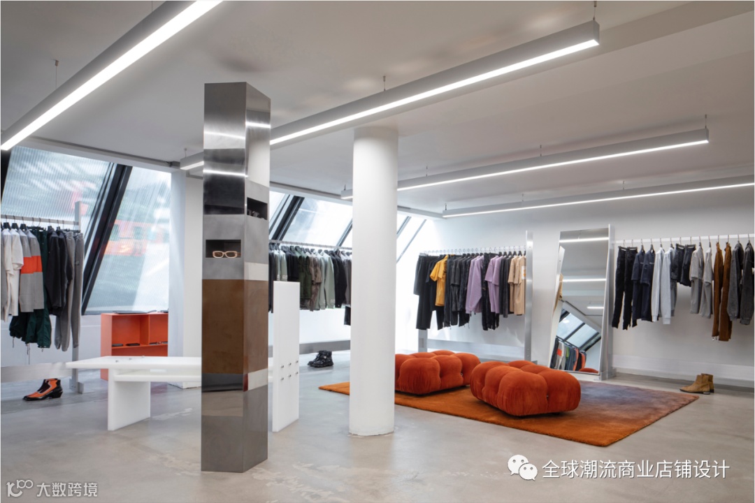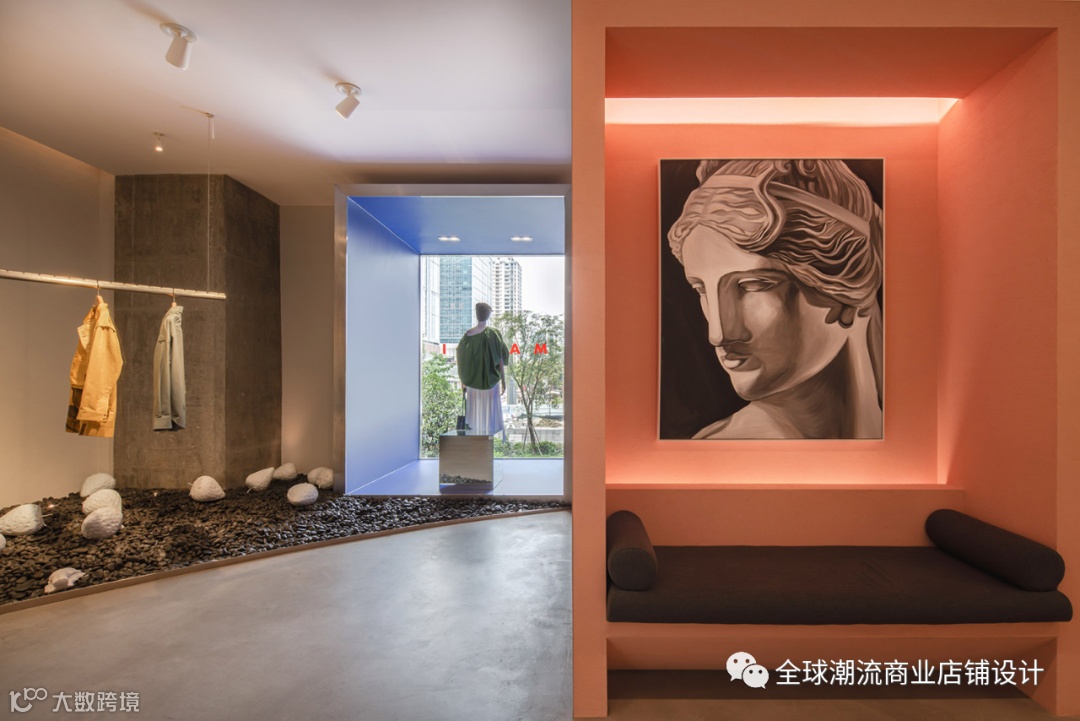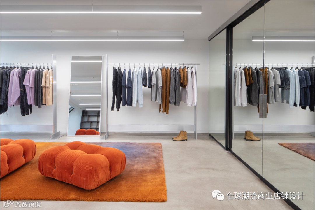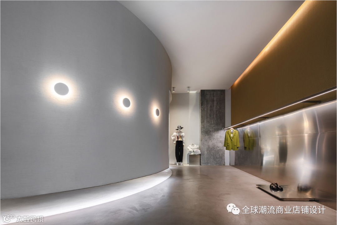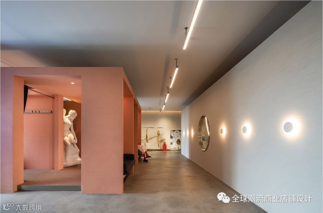 结合场地条件与工期要求,设计师抛弃传统服装商业空间对展陈设计的过度追求,保留了混凝土柱和部分混凝土墙壁原有的材质肌理,天花仅仅做了喷白处理。