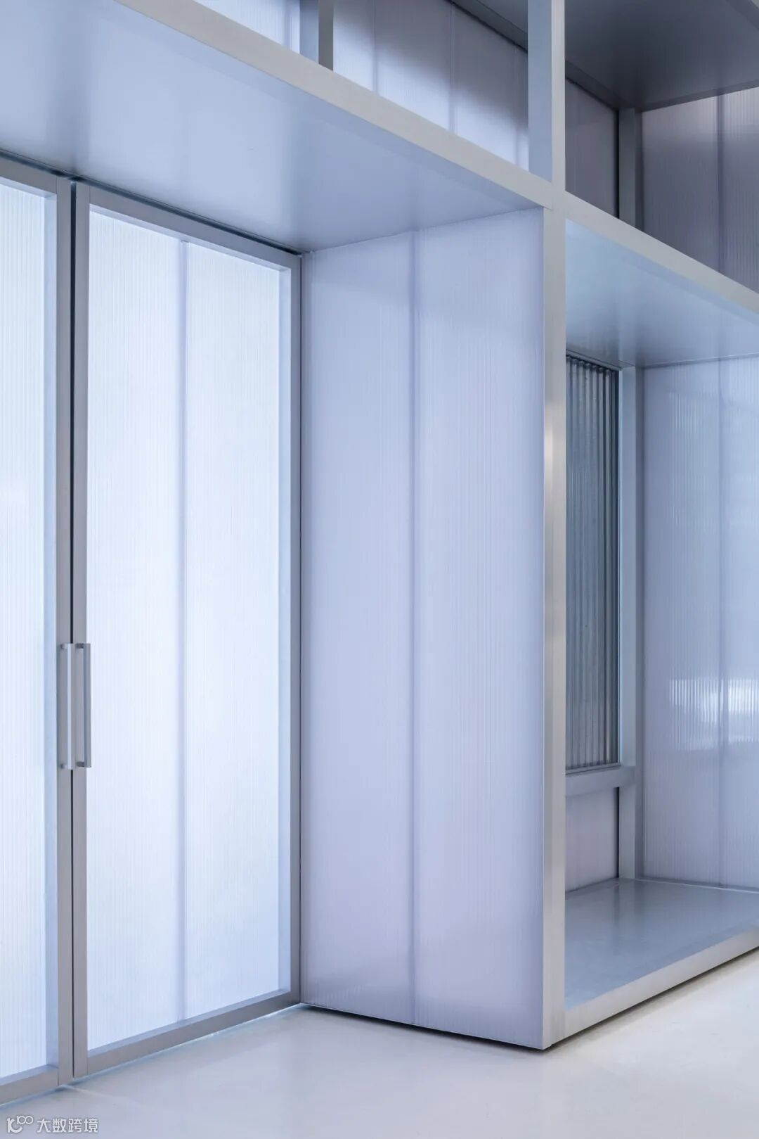 刷白的定向刨花板将空间的底部墙面围合,并结合冷冽的不锈钢搭建出了空间中部的展台,天花线性的灯带则强调了一种秩序感——空间中没有冗余的外在装饰,显示出一种克制的实验美感。
