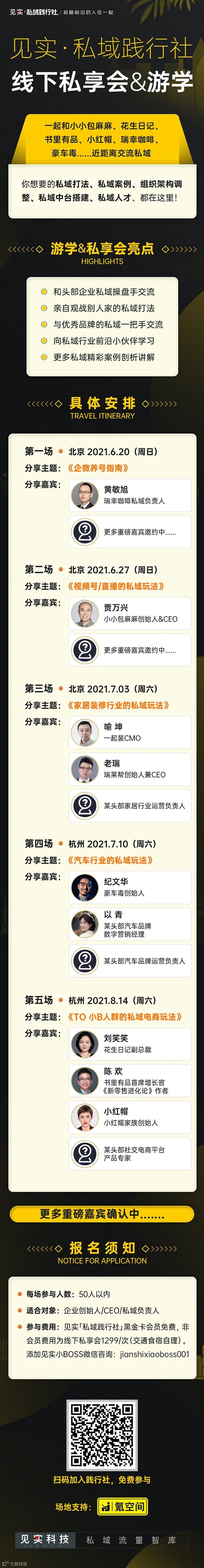 这5场线下私域游学的话题包含“企微养号指南”、“视频号*私域的组合玩法”、“私域中的小B模式搭建”,以及围绕部分行业等,扫描海报二维码报名,践行社会员免费参与。