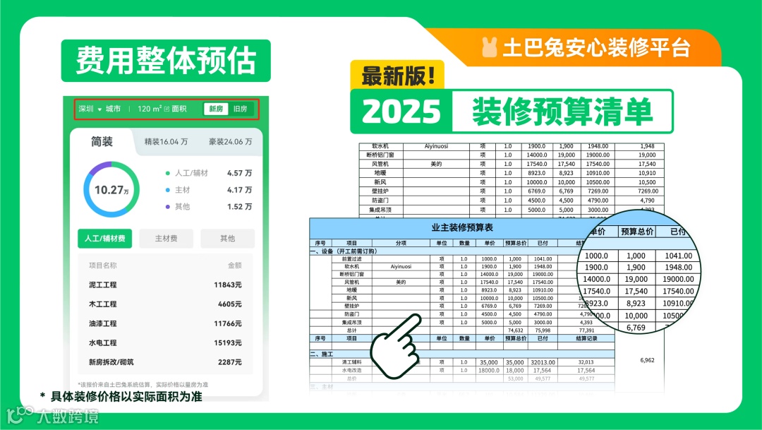 免费获取主材、辅材、人工费等102项明细预算表拿着清单去对比,少花一笔冤枉钱,具体价格以实际装修方案为准