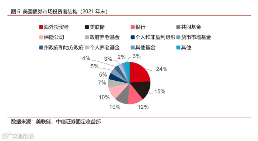 美国债券市场的投资者较为多元,包括银行、基金、保险、政府和海外投资者等。从投资者结构的角度来看,根据美联储美国金融账户表(Financial Accounts of the United States)的统计数据,外资是美国债券市场最大的投资者,持有美国各类债券、占债市总规模的比例约为24%。在实施了多轮量化宽松和债券购买计划之后,美联储是当前美国债市的第二大投资者,占比约为15%,它持有的债券以美国国债和MBS为主。银行、共同基金和保险公司投资债券的占比接近,分别为12%、10%和10%,政府和个人养老基金合计也同样约占10%。其余的投资者占比则相对较小。