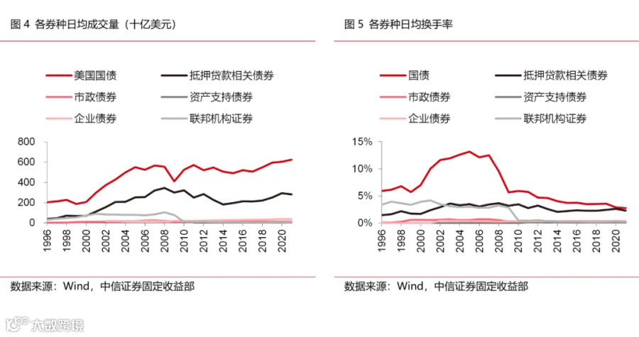 美国债市MBS的交易同样十分活跃,它的日均成交量大概在2000-3000亿美元之间,日均换手率则是长期稳定在2%-4%之间。但不同类型MBS的流动性分化较为明显,目前虽然非机构MBS约占MBS总量的12.5%,但其交易量仅占整体MBS日均交易量的0.5%,反映非机构MBS的流动性表现不佳。