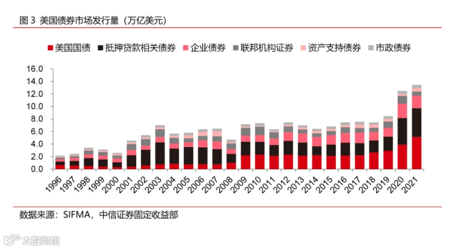 虽然美国债券市场在发展的过程中经历过起落,但其发行量在二十多年来总体实现了大幅增长。1996年,美国债券市场的年发行量仅为2.1万亿美元,此后开始震荡上行至2007年的6.5万亿美元。虽然在2008年,债市年发行量受到次贷危机的影响而一度萎缩至4.7万亿美元,但此后便回升并重新稳定在每年6-7万亿美元左右。新冠疫情期间,国债的大规模发行带动债市年发行量达到2020年的12.5万亿美元和2021年的13.8万亿美元。