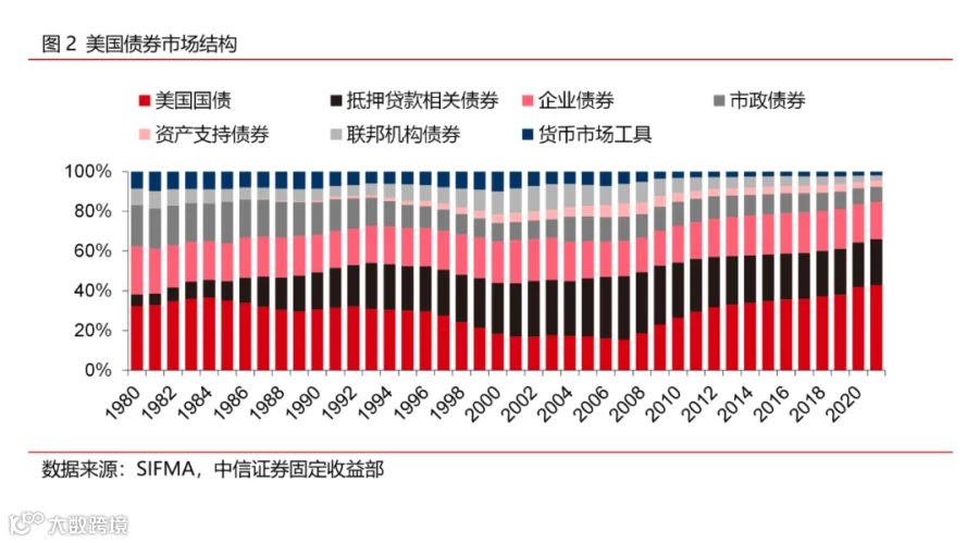 虽然当前美国债券市场的规模在各国债市之中首屈一指,但是在18世纪末期,美国的债券市场尚处于襁褓之中,用于为战争募资的债券在见证了美国诞生的同时,也孕育了日后全球最大的债券市场的雏形。美国建国之后,纽约证券交易所的成立为美国债券带来了稳定的交易场所,此后,美国债券市场中的品种不断扩充,企业债券、市政债券等新型债券品种相继被推出。上世纪40年代随着机构投资者占比的扩大使其债券交易逐步转向场外,上世纪60年代,抵押贷款相关债券(MBS)的推出为美国债券市场的发展再添动力,1980年之后,美国债券市场逐步成为世界上规模最大的债券市场。根据国际清算银行(BIS)统计的数据,1980年至今,美国债券市场规模以平均每年8.6%的速度增长,从约1.9万亿美元快速发展至2021年末的49万亿美元,占全球债市总规模的38.7%,这一占比几乎是排名第二的欧洲债市的两倍。