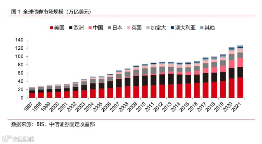 债券融资凭借其低成本、低风险的特性,已逐渐成为最重要的融资手段之一,带动全球债券市场蓬勃发展。21世纪以来,全球债券市场维持了较为高速的增长势头。尽管2010年开始的欧债危机在随后几年内拖累了全球债市的发展,但此后伴随中国债市的高速扩容,全球债市规模自2016年起又重寻上行动力,截至2021年4季度末,根据国际清算银行(BIS)的统计数据,全球债券市场规模已达到约127万亿美元。美国、欧洲、中国和日本债市都是全球债市的重要组成成分,其中美国债市的规模最为庞大。